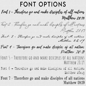 You can choose to keep the artwork as is, or personalize it with your favorite Bible verse or custom text. If you select the custom option, you can enter your text in the text box above or email it to us later at hello@givinggoodnews.com. You’ll also be able to choose a font style from the options shown in the image above. If you choose custom text, we’ll send a mockup for you to approve before printing.