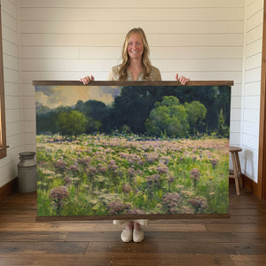 Every canvas is hand-framed using lightweight natural pine on the top and bottom, finished with a non-toxic, zero VOC stain and varnish. Keyhole slots are routed into the back for a flush mount, making it ready to hang right out of the box.
